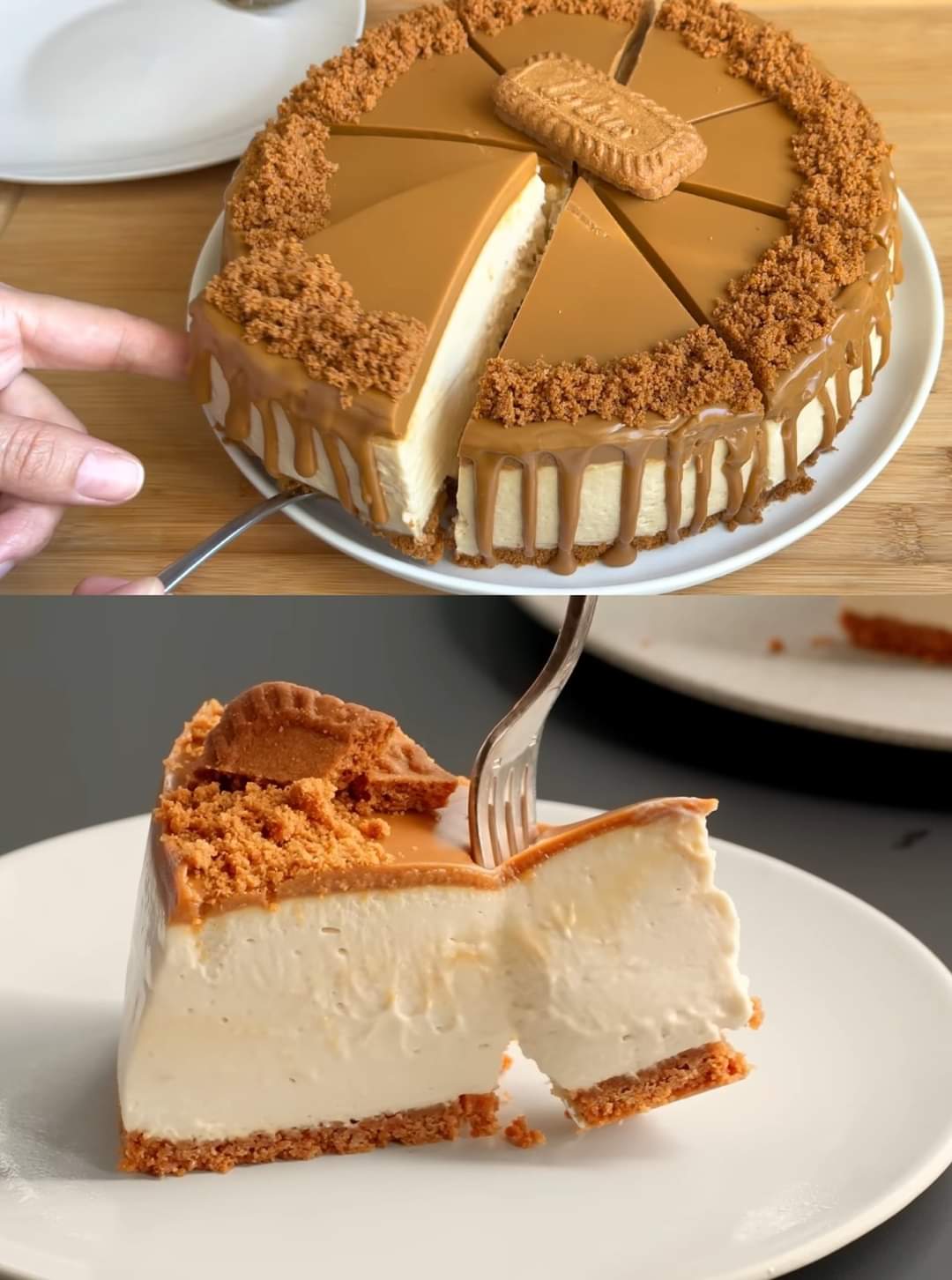 4. Nun die Creme auf dem Keksboden verteilen und den Käsekuchen ohne Backen mindestens 4 Stunden in den Kühlschrank stellen, damit die Masse fest wird. Mit geschmolzenem Lotus Brotaufstrich verzieren.