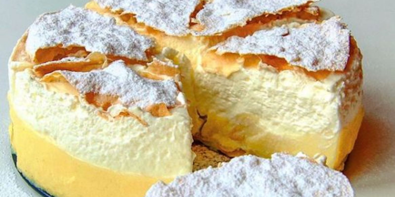 - Vor dem Servieren die Cremeschnitten Torte mit Puderzucker bestäuben.