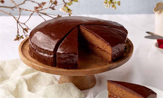9. Für die Glasur: Die Schokolade hacken, in einer Schüssel mit heißer Sahne übergießen und rühren, bis die Schokolade geschmolzen ist. Den Kuchen damit überziehen.