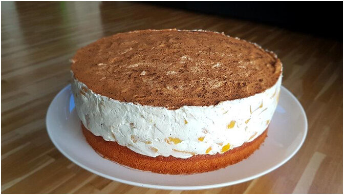 Die erstgenannten Zutaten zu einem Rührteig verarbeiten und in eine gefettete Springform füllen. 20 Minuten bei 200°C backen. Den Kuchen erkalten lassen.