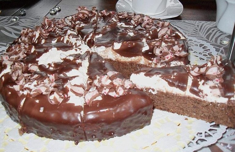 Für den Belag 1 ½ Becher Sahne mit Sahnesteif steif schlagen und auf den Boden streichen. ½ Becher Sahne mit 100g Zartbitterschokolade aufkochen und abgekühlt über die Torte streichen.