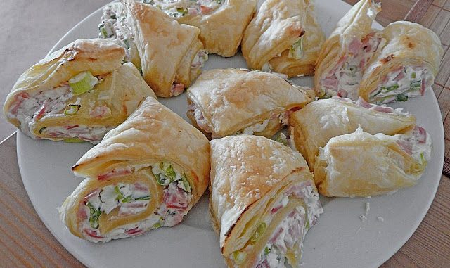 Diese Masse gut auf dem ausgebreiteten Blätterteig verteilen. Nun den Teig vorsichtig zusammenrollen und in ca. 3 cm dicke Scheiben schneiden. Die Scheiben auf ein mit Backpapier belegtes Backblech legen.