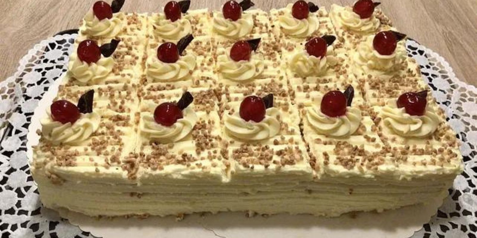 9. Zum Schluss bestreuen Sie die Oberseite der Frankfurter Kranz Schnitten mit gehackten Haselnüssen und garnieren Sie sie mit Kirschen oder anderen Früchten nach Belieben.