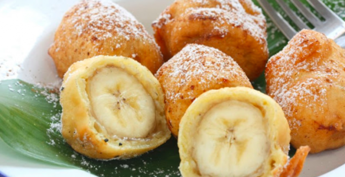 In der Zwischenzeit das Öl in einer tiefen Pfanne erhitzen. Bananen schälen und in ca. 2-3 cm lange Stücke schneiden. Die Bananenstücke zügig in den Teig tunken und dann im heißen Öl goldgelb ausbacken.