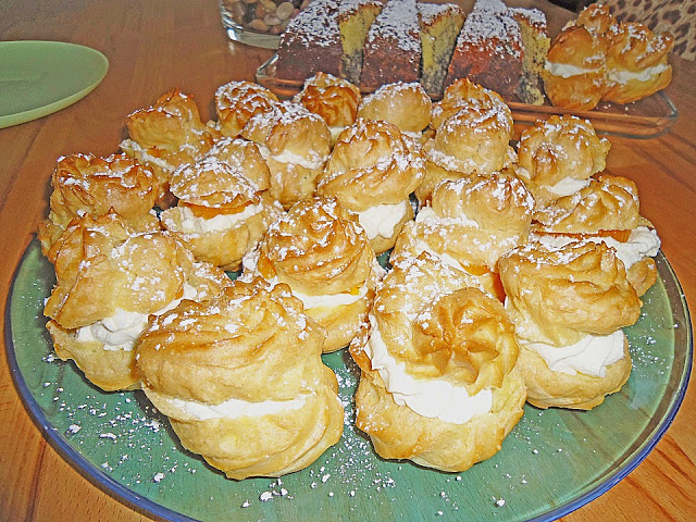 Erst ganz kurz vor dem Servieren die Sahne mit Sahnesteif, Zucker und Vanillinzucker steif schlagen und mit eine Spritze oder eine Löffel in die Windbeutel füllen.