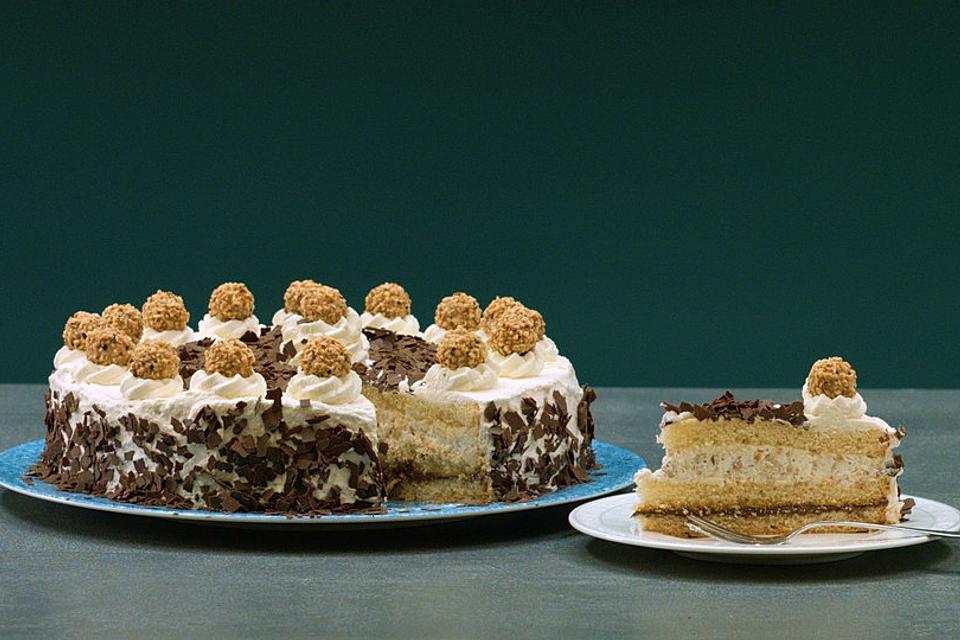 Auf den ersten Boden Nutella streichen. Darauf kommt die Hälfte der Giottosahne. Den zweiten Boden auflegen, die restliche Giottosahne darauf verteilen und den letzten Boden auflegen.