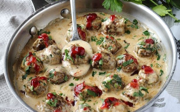 3.Für das Püree Kartoffeln abgießen. Milch und Butter zufügen, alles fein zerstampfen. Mit Salz und Muskat abschmecken. Hackbällchen mit Preiselbeeren anrichten. Püree dazu reichen.