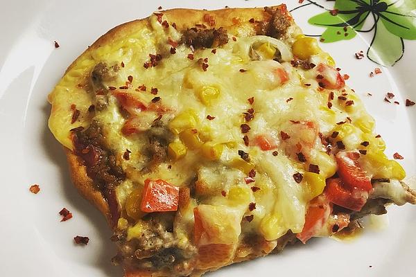Den Pizzateig auf einem vorbereiteten Backblech verteilen und mit der Tomatenpaste bestreichen. Wenn ihr den Teig selber gemacht habt, einfach mit Tomatenmark bestreichen. Mit Basilikum und Oregano würzen. Dann das Hackfleisch und den Mais über darüber streuen. Die Zwiebeln schälen, in Ringe schneiden und verteilen. Dann die Sauce Hollandaise gleichmäßig verstreichen. Zum Schluss den Käse darüber streuen.