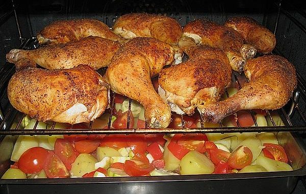 Die Kartoffeln in einer Fettpfanne verteilen und mit Olivenöl beträufeln. Dann mit Salz, Pfeffer und Rosmarin würzen. Über die Fettpfanne einen Grillrost und darauf die Hähnchenschenkel legen. Die Fettpfanne samt Grillrost in den Ofen schieben und ca. 20 Minuten braten/grillen. Nun tropft das leckere Hähnchenfett auf die Kartoffeln, was einen ganz tollen Geschmack gibt.