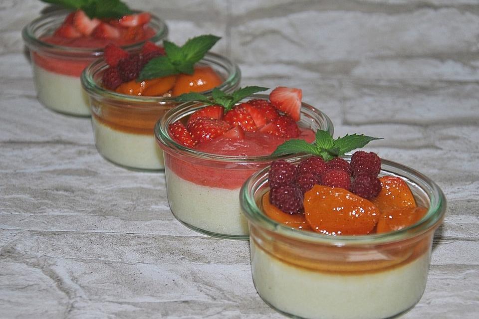 Milch, Sahne, Zucker, Vanillinzucker und Grieß in einen Kochtopf geben, verrühren und zum Kochen bringen. Auf kleiner Flamme, unter ständigem Rühren, ca. 7 min. köcheln lassen. Die Butter unter den noch heißen Grießbrei rühren.