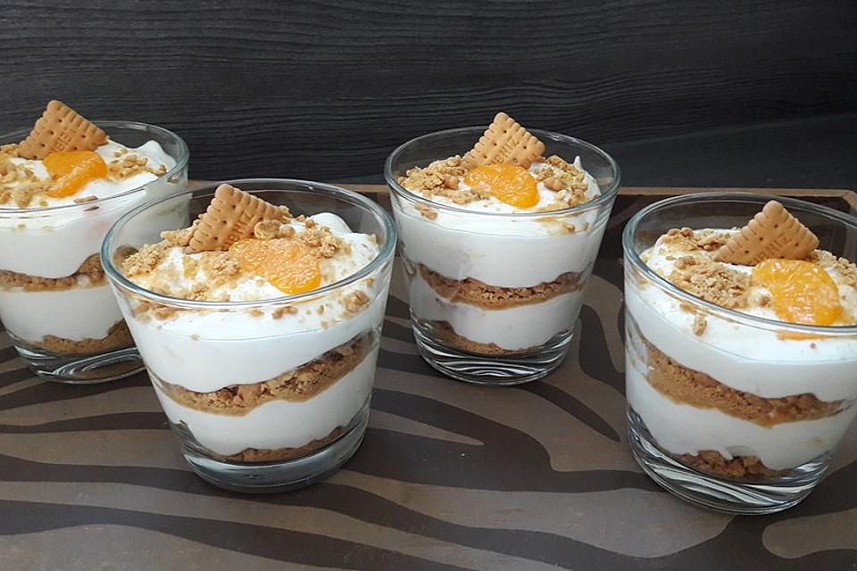 Wahlweise in Dessertgläser oder eine große Schüssel schichten. Zuerst eine Schicht Kekse, danach Quark-Joghurt-Creme. Mit einer Schicht Kekse abschließen.