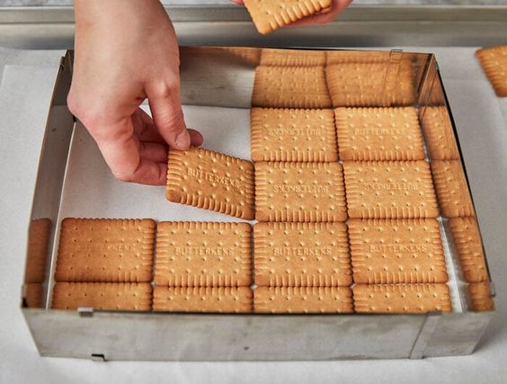 - Die Butterkekse in eine rechteckige Form legen, sodass der Boden vollständig bedeckt ist.
