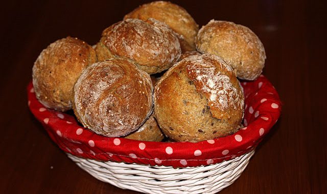 In den heißen Backofen schieben und ca. 40 Minuten backen. Die Brötchen sollen hohl klingen, wenn man sie zur Probe von unten her beklopft. Dann mindestens 20 Min. mit dem Anschneiden warten.
