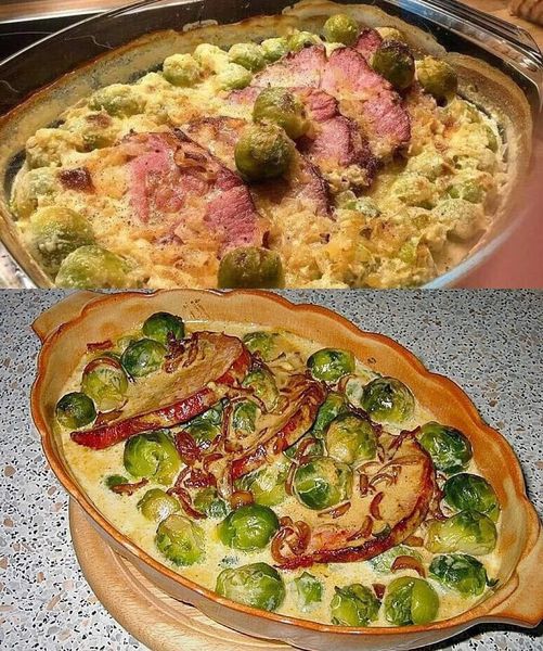 Den Boden einer feuerfesten Form mit 1 Teelöffel Butter oder Margarine einfetten. Die vorbereiteten Kartoffeln, Rosenkohl und das Kasseler hineingeben. Die köstliche Soße gleichmäßig darüber verteilen und mit dem verbleibenden geriebenen Käse bestreuen.