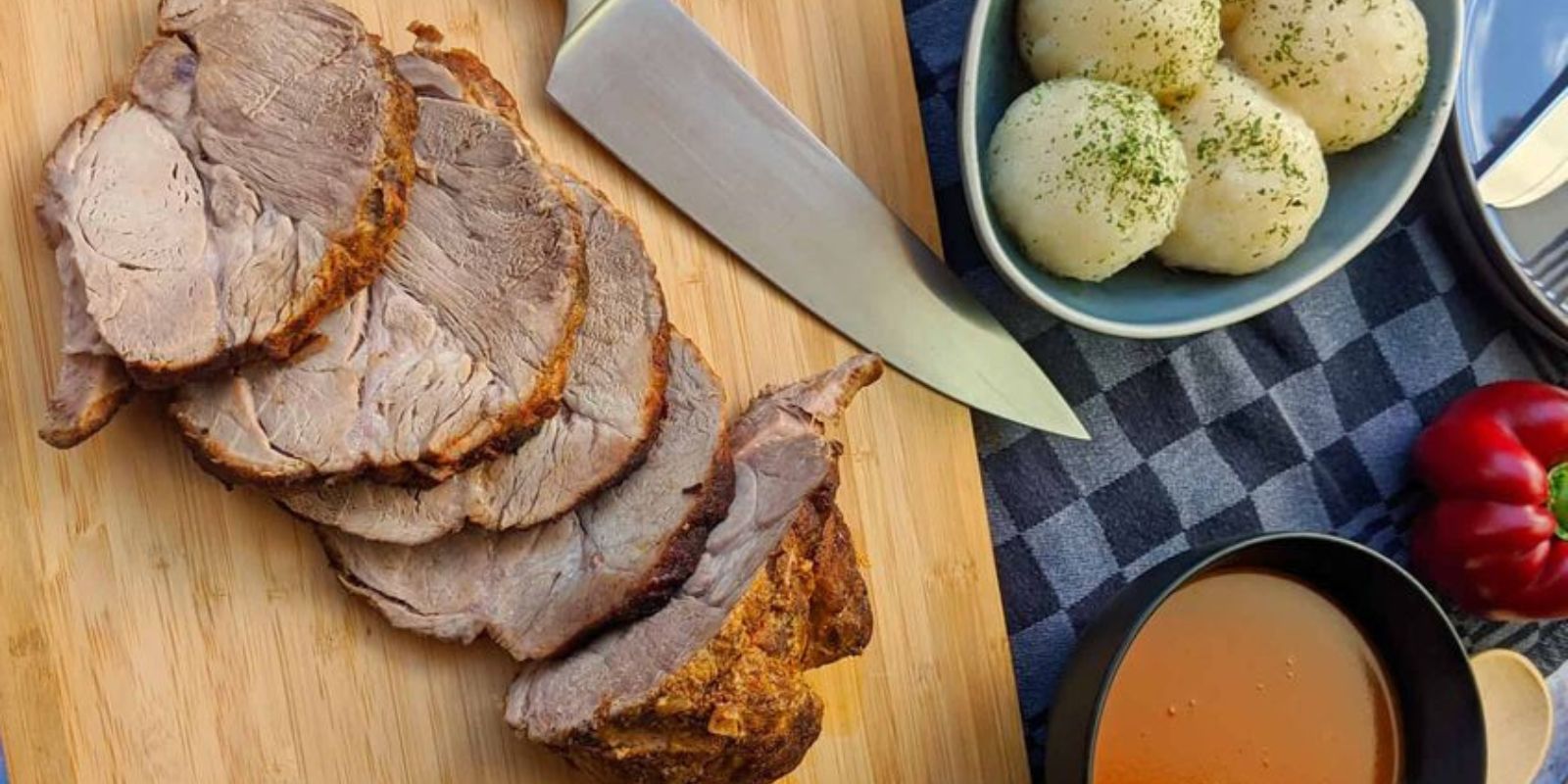 - Den Krustenbraten in Scheiben schneiden und mit der krossen Schwarte servieren.