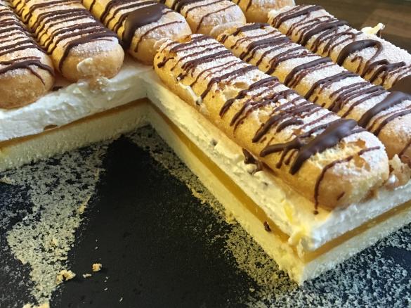Den erkalteten Pudding auf dem erkalteten Kuchenboden gleichmäßig verteilen. Danach die Sahne darauf geben. Butterk/Biskuitkekse darauf verteilen und mit Schokoglasur bestreichen.