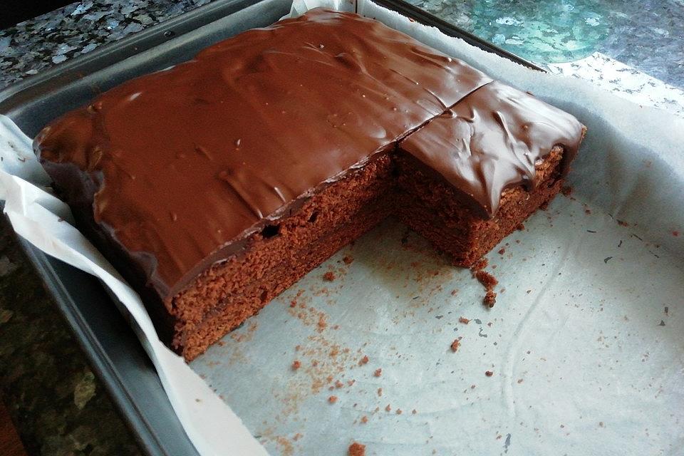 Den fertigen Kuchen aus dem Backofen nehmen, in der Form belassen, und mit einem Holzstäbchen viele Löcher hinein stechen. Die warme Ganache immer wieder mit einem Pinsel über den heißen Kuchen streichen und in den Löchern versickern lassen. Den Kuchen auf ein Kuchengitter stürzen, das vorher mit Alufolie abgedeckt wurde, das Backpapier vorsichtig abziehen. Wieder mit dem Holzstäbchen viele Löcher stechen und die Oberfläche und die Seiten immer wieder mit der Ganache bestreichen, bis diese zu 2/3 verbraucht ist. Den Kuchen ganz auskühlen lassen. Die restliche Ganache mit einer Palette auf den Kuchen streichen und dabei die Löcher und Vertiefungen schließen.