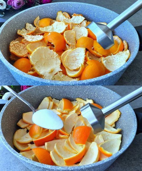 Um dieses Rezept erfolgreich zu machen, müssen Sie einen Topf nehmen und etwa einen Liter Wasser und die Orangenschalen hineingießen. Dann einfach die Esslöffel Salz und den Esslöffel Natron hinzufügen und dann gut vermischen.