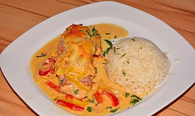 Die Zwiebel in halbe Ringe schneiden und in einer Pfanne in etwas Öl andünsten. Die Chilischote hineinzupfen, den Knoblauch pressen und hinzugeben. Paprikapulver und Tomatenmark hinzufügen, mit der Brühe ablöschen und kurz aufkochen lassen. Anschließend Sahne und Schmand unter die Soße rühren und mit Salz abschmecken. Die Soße in die Auflaufform gießen, Fleisch und Paprikastreifen sollten ganz bedeckt sein. Den geriebenen Käse gleichmäßig darauf verteilen.