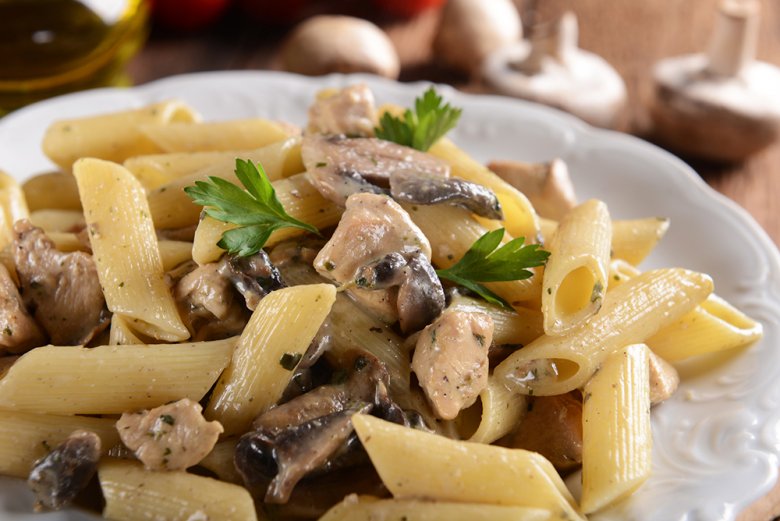 - Zuletzt alles locker miteinander vermischen, die gehackte Petersilie darüberstreuen und die Penne mit Champignons sofort servieren.
