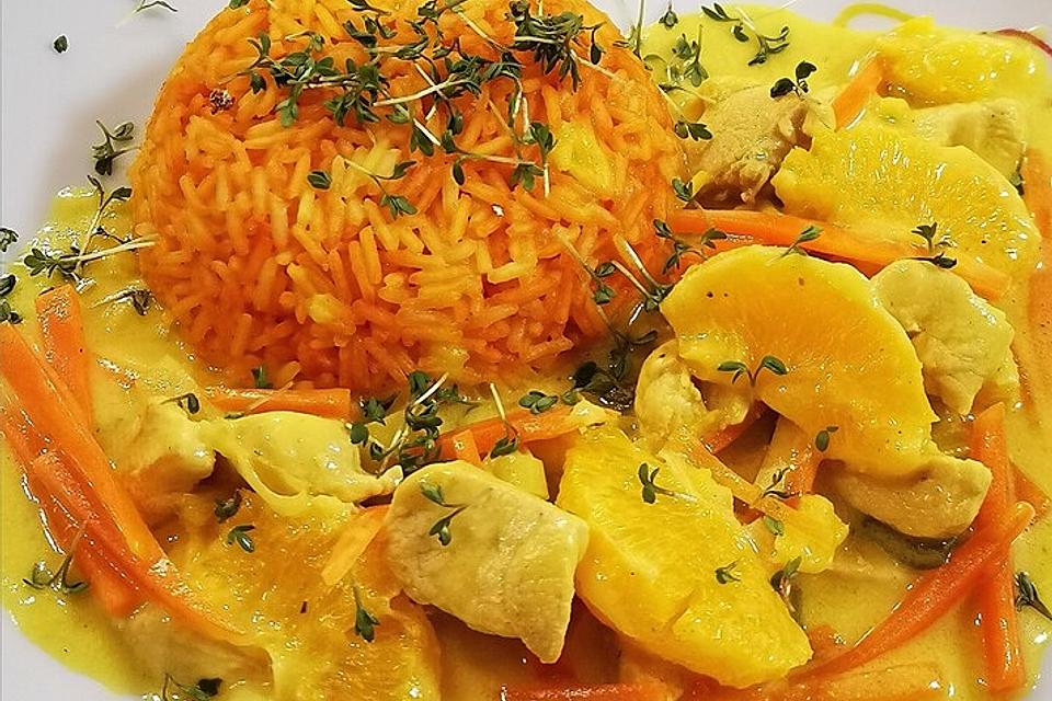 Putenfleisch mit Öl in einer großen Pfanne anbraten. Dann herausnehmen. Im verbliebenen Bratfett die Karottenstifte anbraten. Dann den Knoblauch, die Lauchzwiebel, Ingwer und Chili dazugeben und kurz mitbraten. Mit Weißwein ablöschen und reduzieren lassen. Dann den Orangensaft und die Brühe dazugeben und ebenfalls etwas reduzieren lassen. Dünsten, bis die Karottenstifte nicht mehr so “strohig” sind. Dann mit Sahne aufgießen und aufkochen. Das Fleisch wieder dazugeben und aufkochen. Zum Schluss die Orangenfilets mit dazugeben, erwärmen und mit Salz, Pfeffer und Zitronensaft abschmecken.