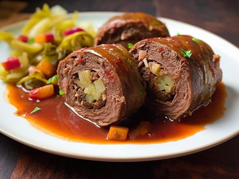 Kurz vor dem Hinzufügen des Gemüses mit Rinderbrühe, Salz und Pfeffer abschmecken und mit ein paar Spritzern Gurkensaft verfeinern. Das alles zu den Rouladen geben, die sich bereits in der Auflaufform befinden. Den Topf entweder auf kleiner Flamme oder bei ca. 160 Grad Celsius anderthalb Stunden kochen lassen, dabei ab und zu Flüssigkeit nachgießen.