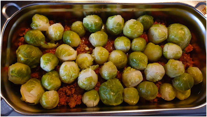 Rosenkohl darauf verteilen und zum Schluss den Käse darüber geben.