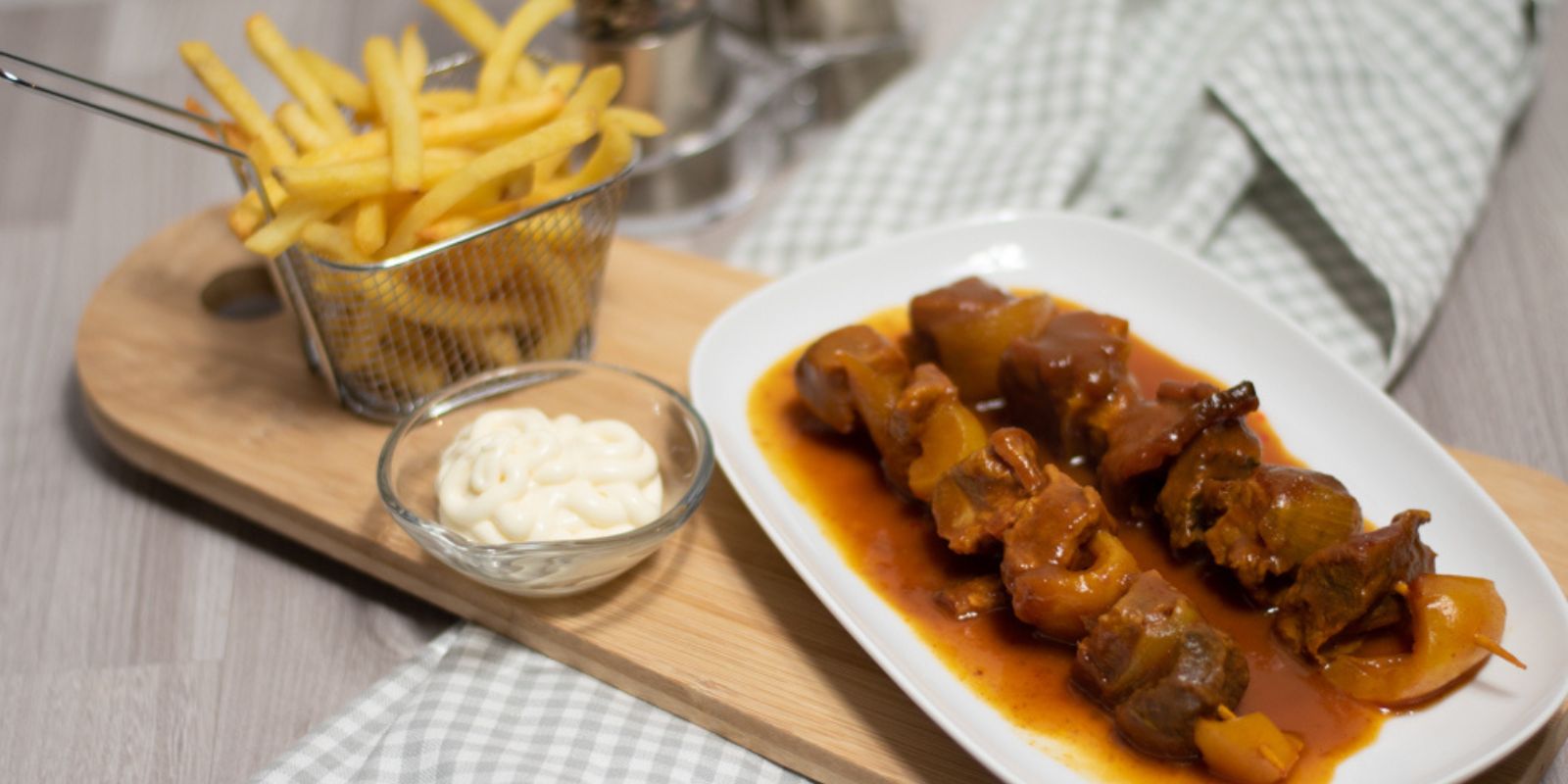 Serve the hot Schaschlik skewers with a side of crispy Pommes (fries). You can also serve it with a dollop of sour cream or a fresh salad for a complete and delicious meal.