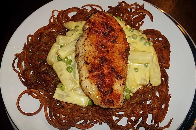 Eine Andere Art der Zubereitung – noch etwas würziger und auch knuspriger – ist, wenn man anstatt die ganzen Hühnerbrüste zu verarbeiten, diese im noch unbehandelten Zustand in kleine Streifen schneidet (wie Geschnetzeltes). Ansonsten das selbe vorgehen.