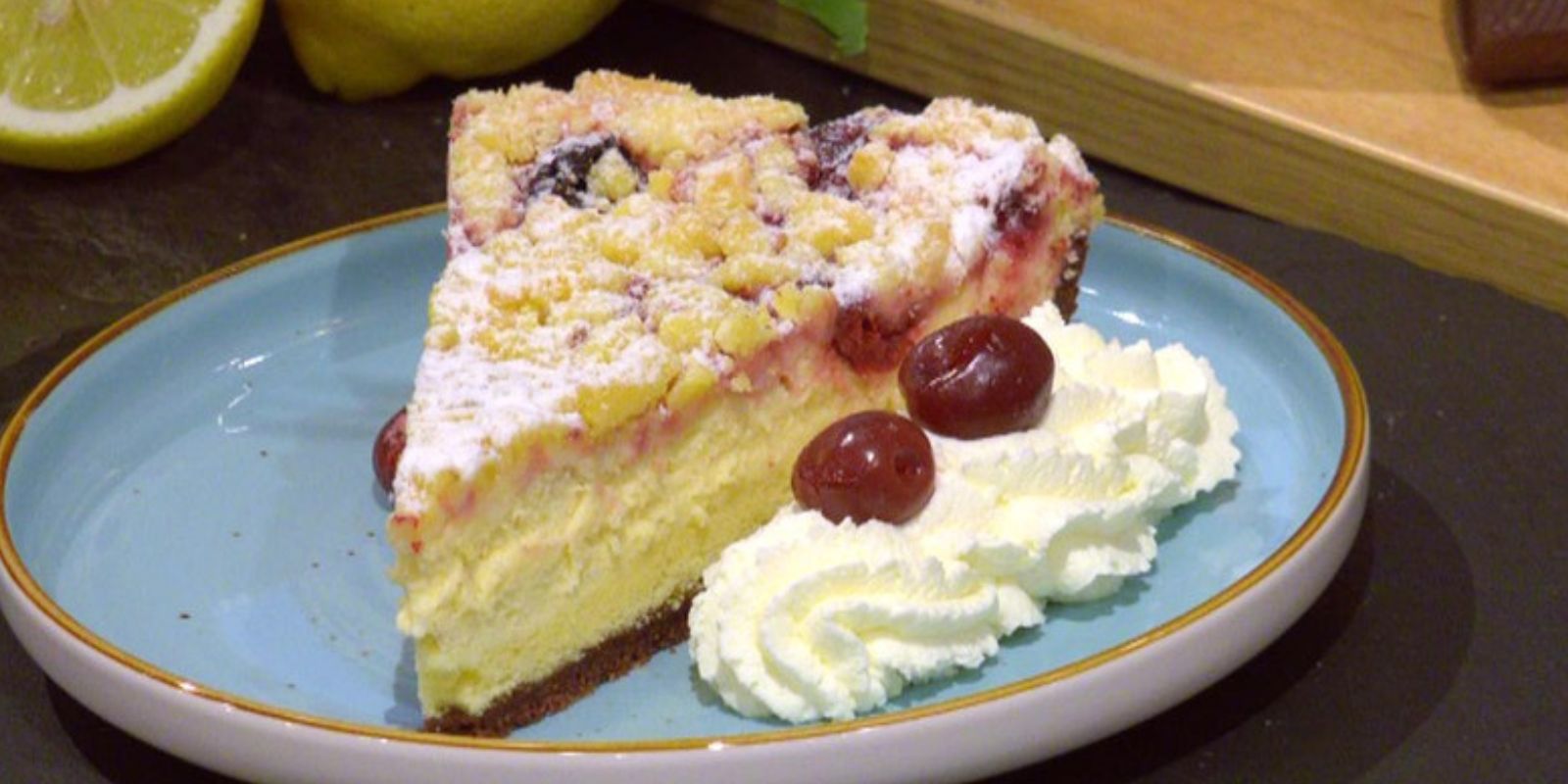 - Streusel herstellen: Für die Streusel Mehl, Zucker und kalte Butter in einer weiteren Schüssel zu bröseliger Konsistenz vermengen. Die Streusel über den Kirschen gleichmäßig verteilen.