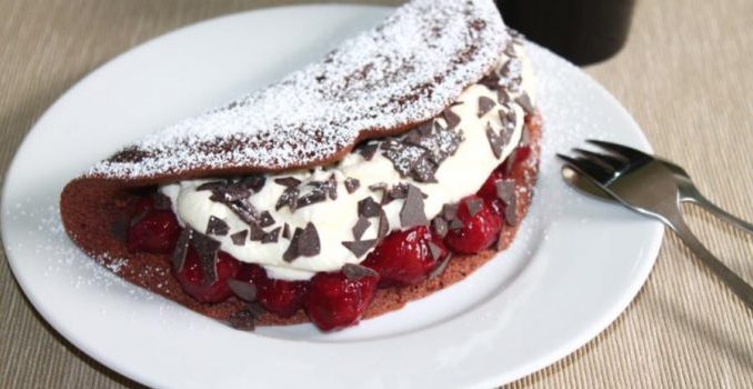 Das Schwarzwälder-Kirsch-Omelette kann für Erwachsene zusätzlich mit ein paar Spritzern Kirschwasser getränkt werden.