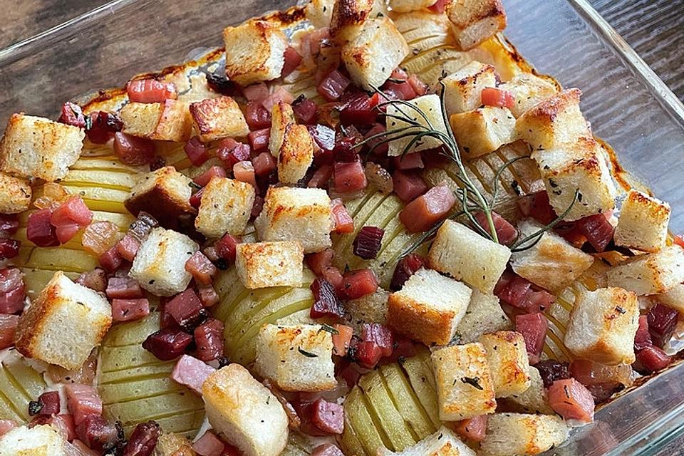 In der Zwischenzeit die Butter zerlassen. Katenschinken und Rosmarin hinzufügen sowie die Toastbrotwürfel dazumischen. Diese Mischung auf den Kartoffeln verteilen und noch einmal so lange backen, bis die Brotwürfel schön braun sind und die Kartoffeln gar.