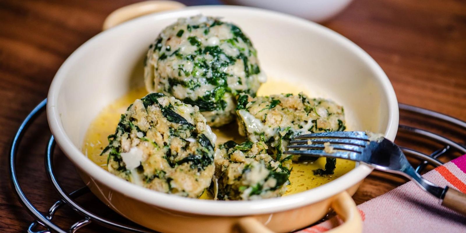 7. Den Spinat mit Käse auf einer Servierplatte anrichten und sofort servieren.