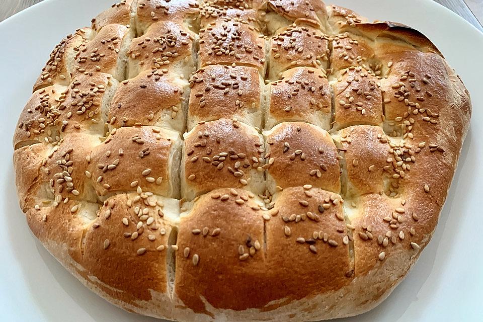 Die Laibe mit einem Wasser-Ei-Gemisch bestreichen. Jetzt mit den Fingerspitzen tief eindrücken (bis fast kleine Löcher entstehen) und nach Bedarf mit Sesam oder Schwarzkümmel bestreuen. Noch einmal 20 Minuten ruhen lassen.