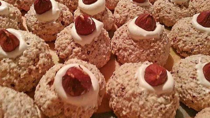 Danach die Masse zu walnussgroßen Kugeln formen und auf ein Backblech setzen, mit einem Holzstiel eine kleine Delle hineindrücken, etwas Eischnee hineingeben und jeweils 1 Haselnuss hineingeben.