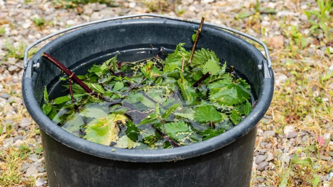 Legen Sie die Brennnesseln in einen großen Behälter, beispielsweise einen Eimer oder ein Fass, bis dieser vollständig gefüllt ist. Ich empfehle, die Brennnesselpflanzen nicht zu pressen. Geben Sie dann das Wasser hinzu , sodass die Brennnesseln bedeckt sind, und verschließen Sie den Eimer anschließend mit dem Deckel. Die Dosierung beträgt: 10 Liter Wasser 1 kg Brennnesseln.