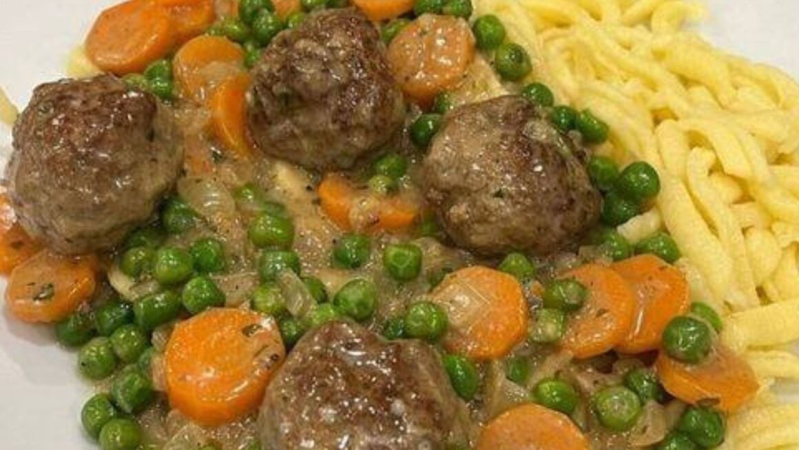 - Die Hackbällchen mit der Erbsen-Möhren-Rahm-Sauce und den Spätzle servieren. Mit gehackter Petersilie garnieren, falls gewünscht.