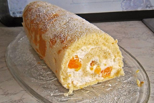 Die Roulade ausrollen und mit der Käsesahnefüllung füllen, wieder zusammen rollen. Mit Puderzucker bestreuen