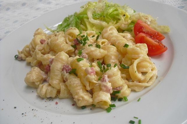 Die Zwiebel und den Schinken würfeln, in Öl hellbraun anbraten. Schmand einrühren, etwas einköcheln lassen. Die fertig gekochten Nudeln dazugeben, mit dem geriebenen Käse bestreuen, rühren, bis der Käse geschmolzen ist.
