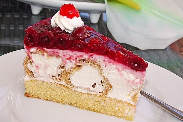 Vor dem Servieren mit roter Grütze (Kirsch oder Waldbeere) bestreichen.