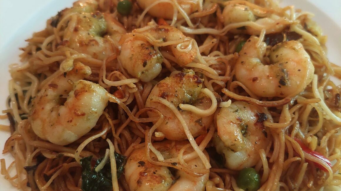 9. Die gebratenen Mienudeln mit Wokgemüse und Garnelen heiß servieren und genießen!