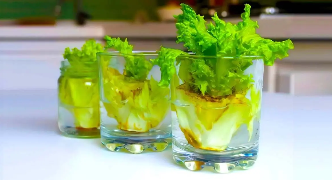 - Legen Sie die Unterseite des Salatkopfes, die Sie normalerweise als verschwendet betrachten, in eine Schüssel mit Wasser.