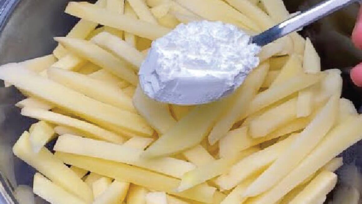 - Espalhe o amido de milho sobre as batatas, de forma que todas as batatas fiquem envolvidas pelo amido.
