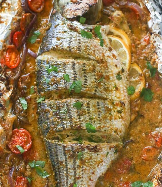Tempere o peixe com limão ,sal e a margarina .Depois coloque ele num refrátario ,sobre uma folha de papel-alúminio, para que possa embrulha-lo depois , e cubra-o com cebola, as azeitonas e os tomates.