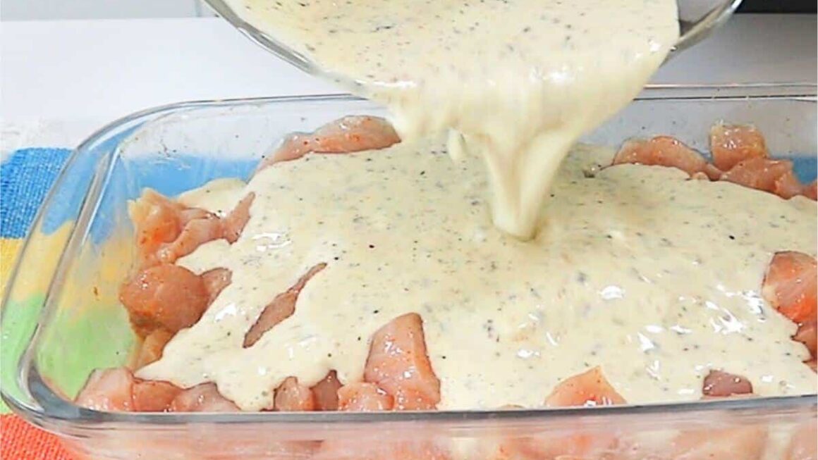 - Mexa até obter uma mistura homogênea e despeje esse creme sobre o frango no refratário.