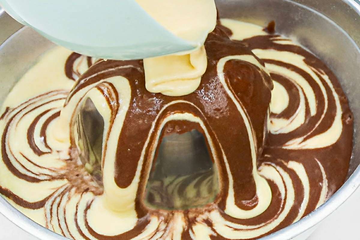 - Esse processo irá criar o efeito “mesclado” do bolo.