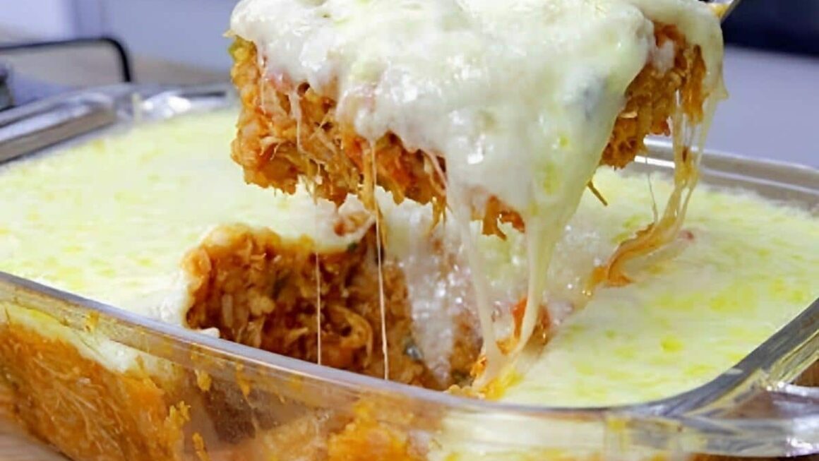 - Acrescente o arroz cozido e misture bem para incorporar todos os ingredientes. Transfira para um refratário, cubra com mussarela ralada.