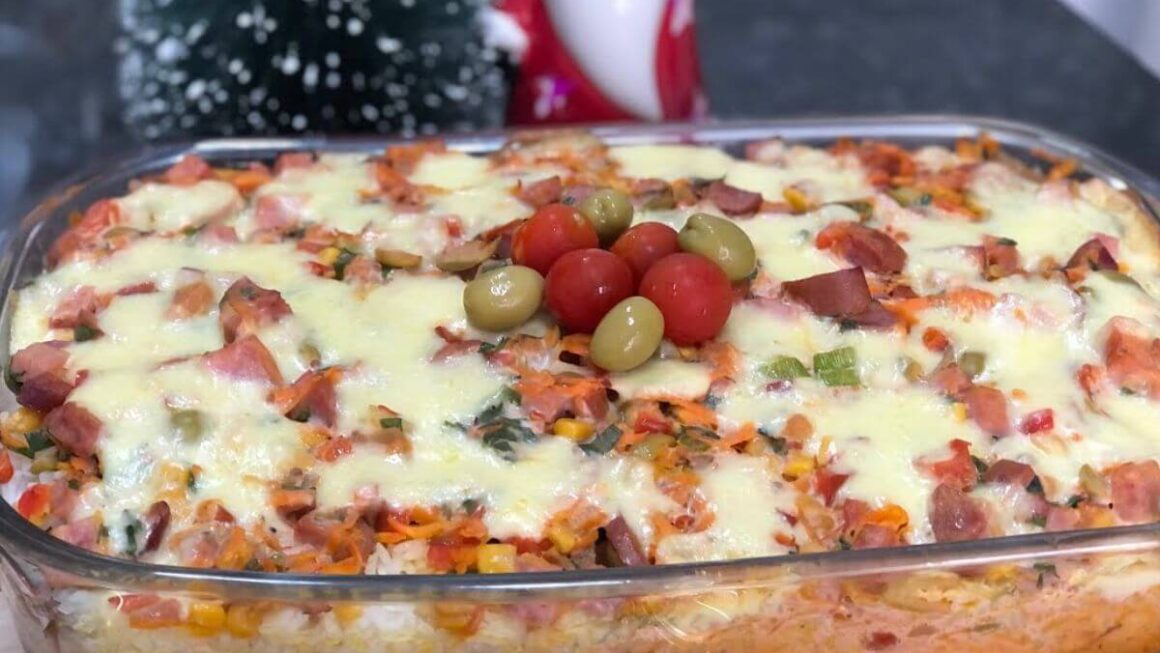 Para fazer arroz de natal iremos precisar para o arroz, linguiça calabresa, milho verde em conserva, bacon, cebola, cenoura ralada, pimentão vermelho, azeitonas verdes, presunto cortado em cubinhos e manteiga ou margarina. Para o molho do arroz de natal vamos utilizar mussarela, creme de leite, molho de tomate, ovos. Para a montagem do arroz de natal, iremos precisar de arroz cozido, tomatinho cereja e azeitonas verde. Teremos que seguir o passo a passo de todos os preparos, para que o resultado do arroz de natal seja um sucesso. Depois disso iremos levar o arroz de natal para gratinar por 25-30 minutos, retirar do forno, decorar com tomatinho e azeitona e saborear cada porção dessa delícia de arroz de natal!