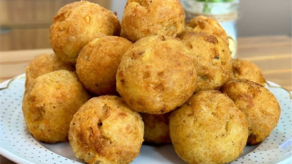 - Repita o processo com o restante da massa, e frite os bolinhos em óleo quente, fogo médio, deixando dourar de ambos os lados. Remova o excesso de óleo em papel toalha.