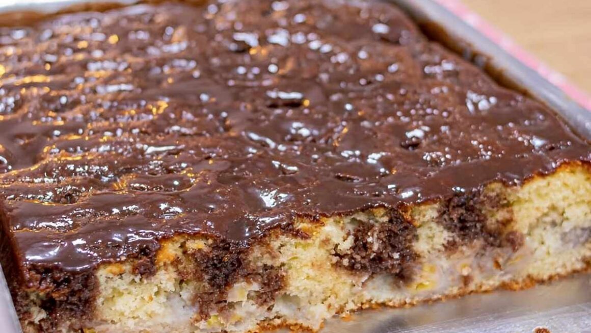 - E um delicioso bolo de banana com cobertura de chocolate ficou pronto. Sirva-se!